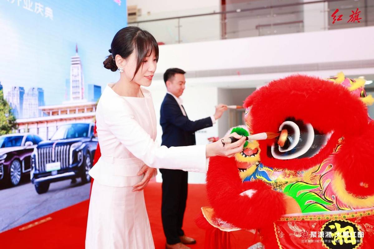 當一汽紅旗汽車銷售有限公司中南區事業部總監程龍佳先生與蘭天集團投資人代表湯佳利女士接過金筆,為醒獅點睛時,現場氣氛達到沸點。三點朱砂分落獅眼與額頭:“左眼觀市場風云,右眼納八方來客,額頭點啟吉祥鴻運。”這一刻,東方神韻與現代商業精神完美交融。