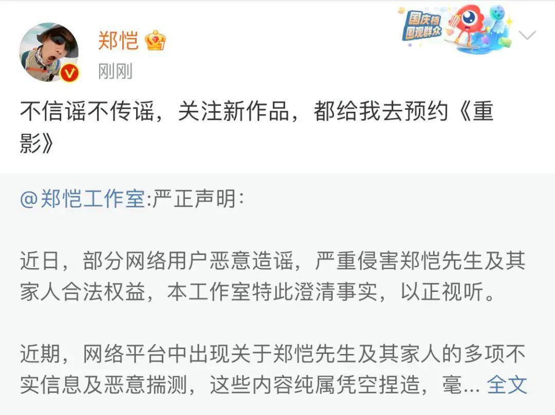 8月26日晚,鄭愷工作室發布嚴正聲明,近期,網絡平臺中出現關于鄭愷先生及其家人的多項不實信息及惡意揣測,“這些內容純屬憑空捏造,毫無事實依據,已涉嫌嚴重侵犯鄭愷先生及其家人的合法權益。”