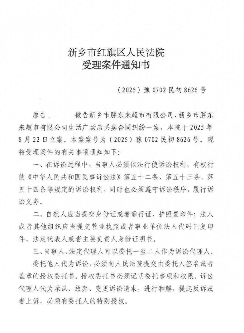8月28日,有消費者質(zhì)疑胖東來免費發(fā)放的一次性筷子沒有標注生產(chǎn)日期,稱已起訴胖東來,并在社交平臺上發(fā)布了受理案件通知書。