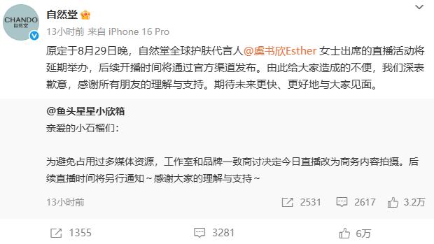 此外,自然堂官方賬號發(fā)文:“原定于8月29日晚,自然堂全球護膚代言人虞書欣女士出席的直播活動將延期舉辦,后續(xù)開播時間將通過官方渠道發(fā)布。由此給大家造成的不便,我們深表歉意,感謝所有朋友的理解與支持。期待未來更快、更好地與大家見面。”