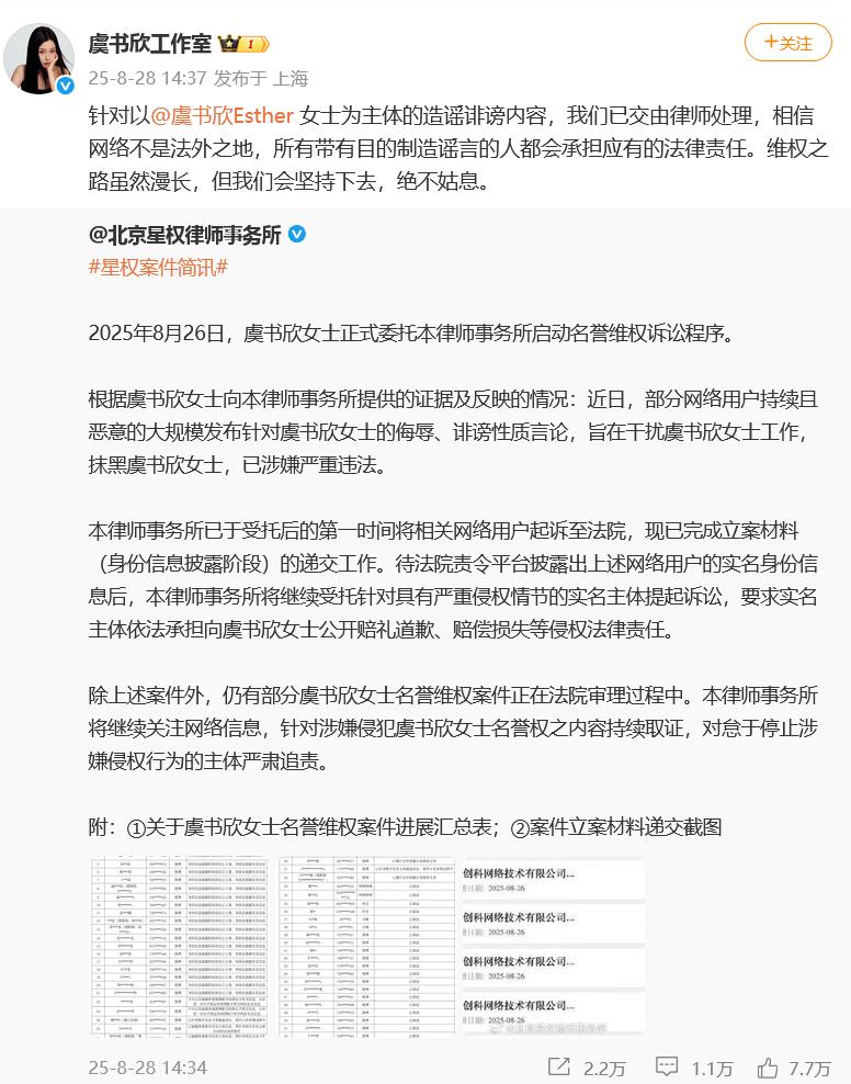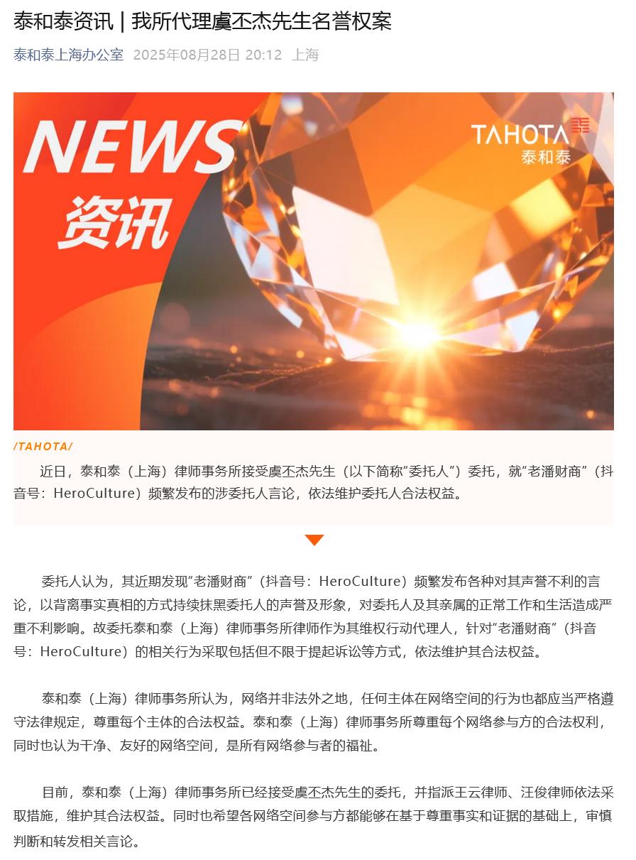 近日,虞書欣因參與的綜藝《一年級·畢業(yè)季》事件及“老潘財商”事件等引發(fā)熱議。8月28日晚,泰和泰(上海)律師事務所宣布已經(jīng)代理虞書欣父親虞丕杰名譽權案。“委托人認為,其近期發(fā)現(xiàn)‘老潘財商’(抖音號:HeroCulture)頻繁發(fā)布各種對其聲譽不利的言論,以背離事實真相的方式持續(xù)抹黑委托人的聲譽及形象,對委托人及其親屬的正常工作和生活造成嚴重不利影響。故委托泰和泰(上海)律師事務所律師作為其維權行動代理人,針對‘老潘財商’(抖音號:HeroCulture)的相關行為采取包括但不限于提起訴訟等方式,依法維護其合法權益。”