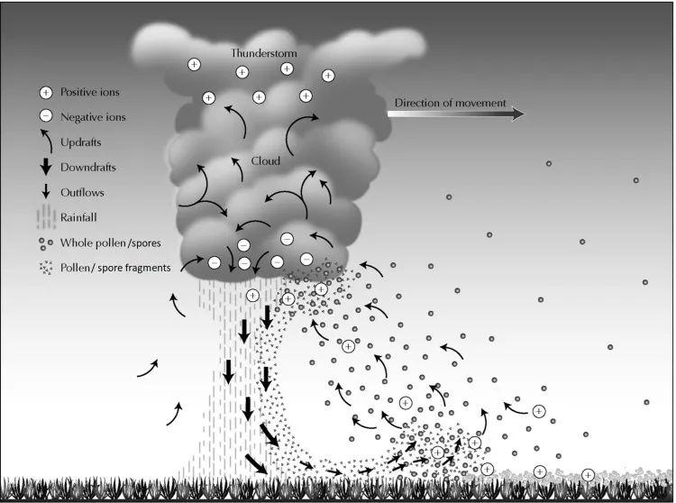 ·雷暴發(fā)生前,氣溫驟降、大風(fēng)呼嘯,會把地面的花粉、霉菌顆粒“卷”到云層里。