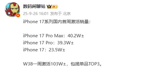 9月26日,據(jù)博主@數(shù)碼閑聊站最新爆料,iPhone 17系列在中國市場正式發(fā)售首周(W38)激活量約達103萬臺,其中Pro Max與Pro兩款高端機型合計占比接近八成。