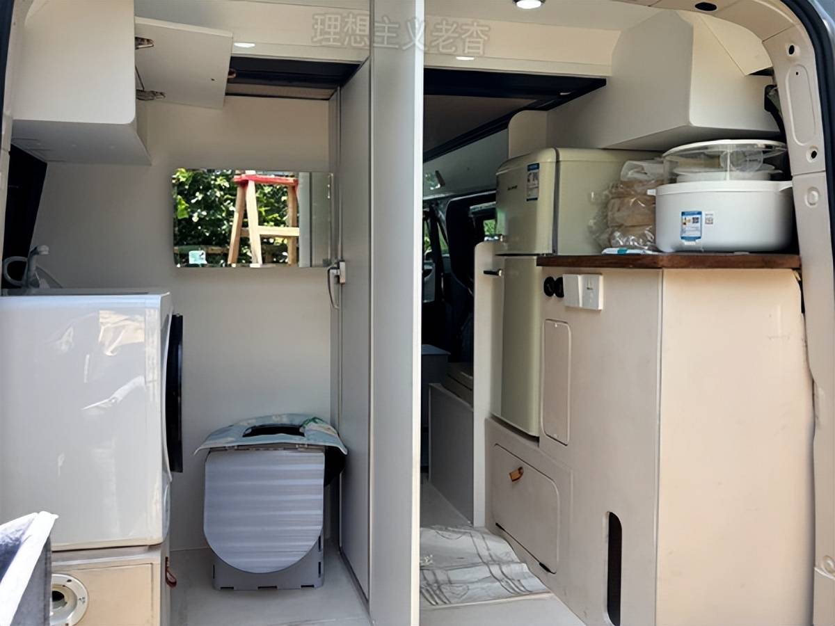 車尾也是別有乾坤,右側是微廚區,有車載冰箱和電飯鍋等廚房用品,帶上食材就可在車內做飯;左側是洗手間,可淋浴,可如廁,還可洗衣服,真可謂麻雀雖小五臟俱全。
