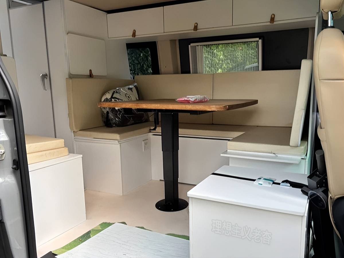 該車為4門5座,后排座椅變成了箱式U型沙發,中間添置了一張升降桌,組成車載小客廳,是日常喝茶吃飯與學習辦公的地方。