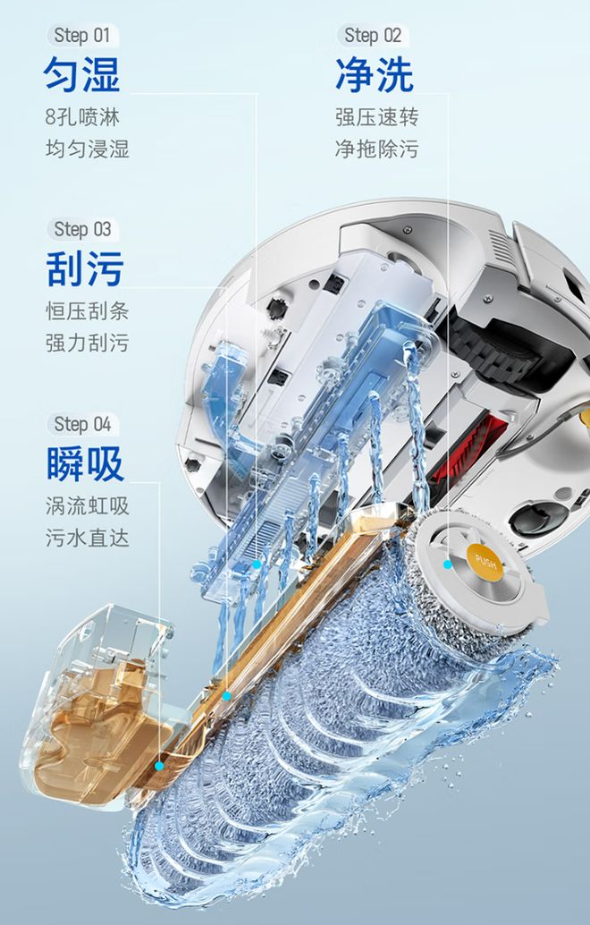 目前市面上第一梯隊的掃地機器人基本上都采用了活水洗地,實時清洗拖布,不將臟污帶到干凈地面,以防二次污染,是目前掃地機在清潔方面比較理想的解決方案。但即便如此,還是有不少產品存在痛點:比如滾筒較短、下壓力不足,清潔頑固污漬時還有些“心有余而力不足”,還有的產品沒有恒壓刮條,拖布清洗不徹底,刮水條內容易藏污納垢等問題,影響使用體驗。