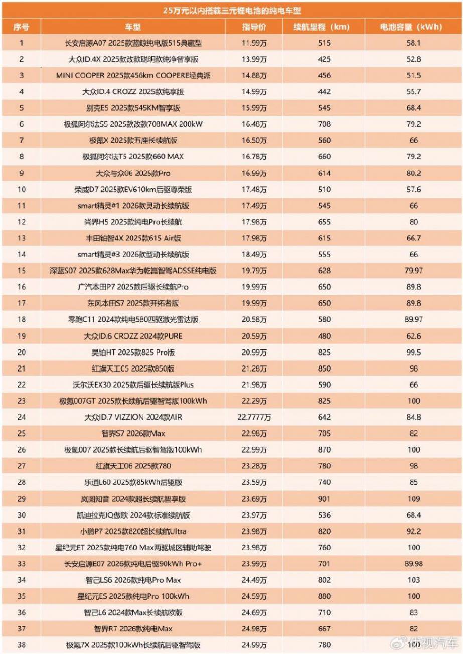 簡單統(tǒng)計了一下,目前25萬元以下的純電車型中,有將近40款車型搭載了三元鋰電池。三元鋰電池已經(jīng)開始向中低端市場下探。