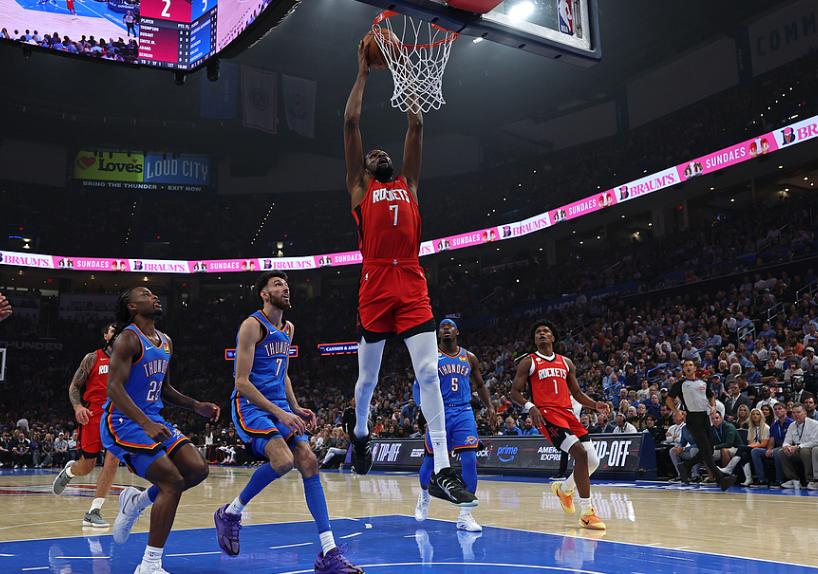 進入到比賽當中,杜蘭特借助申京搶斷亞歷山大后的妙傳,用一次快攻雙手暴扣貢獻他火箭生涯首球。杜蘭特隨后接連用標志性干拔中投得分,還一度補防大帽亞歷山大(并未記錄為蓋帽)。首節比賽杜蘭特打滿12分鐘,貢獻8中3得到8分1籃板。