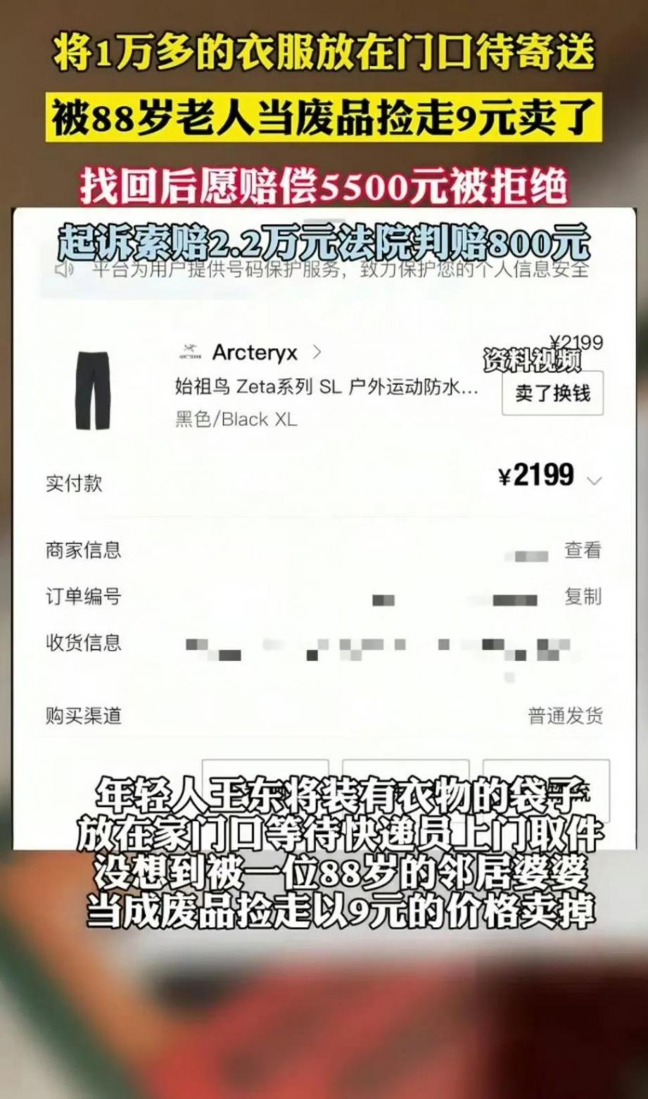 事情要從4月15日說起。王東(化名)將兩袋待寄衣物放在家門口,里面有3439元的始祖鳥沖鋒衣、2199元的沖鋒褲等,總價值超1.5萬元。他外出辦事期間,88歲的鄰居張婆婆(化名)路過,見袋子孤零零放著,便當成廢品撿回了家,轉天以9元價格賣給了回收站 。