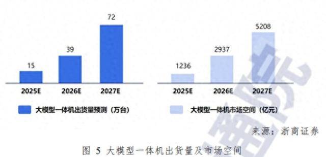 浙商證券預測,2025年至2027年大模型一體機需求量將分別達到15萬臺、39萬臺和72萬臺,對應的市場空間將從千億級別迅速擴張,至2027年有望突破5000億元人民幣。