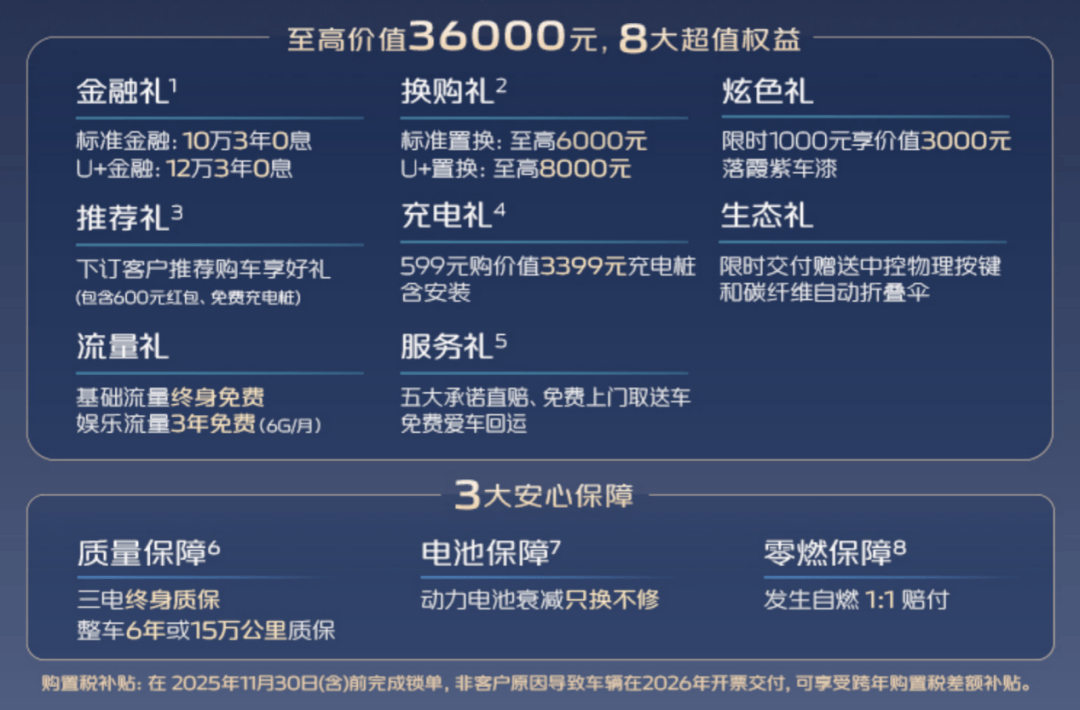 上市期間,消費者在11月30日前下單,可享受最高12萬3年0利息、最高8000元官方置換補貼、599元購買3399元充電樁、延遲交付跨年購置稅差額補貼等權益,另外,購買長安啟源A06還可享受三電終身質保,整車6年15萬公里質保,動力電池衰減只換不修,自燃1:1賠付等保障。6.0800.hk