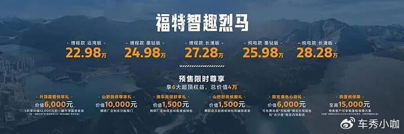 此前,福特智趣烈馬已經開啟預售,增程版提供遠灣版、墨鉆版、長灘版三款,預售價分別為22.98萬、24.98萬與27.28萬;純電版推出墨鉆版與長灘版,預售價分別為25.98萬與28.28萬。