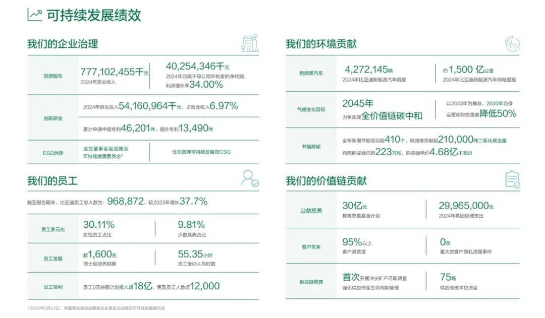 2024年,比亞迪以ESG治理為引擎,全面升級公司ESG管治架構,發布“DREAMS”可持續發展戰略,承諾2045年碳中和目標,并圍繞供應鏈ESG管理、人才發展、產品創新等關鍵維度,制定可量化、可追蹤的階段性目標。我們始終高度關注廣大利益相關方對公司的ESG發展期望,已連續14年發布社會責任報告,并在2025年發布首份可持續發展報告,深度融合國內外ESG標準指引,將信息披露透明度提升至新高度。