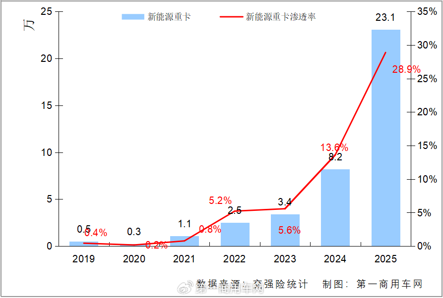當前,一談到重卡,繞不開的一個話題就是電卡。新能源重卡在2025年可謂高歌猛進,從2024年的8.2萬輛直線躍升到2025年的20萬輛以上,簡直稱得上是商用車這條街上“最靚的那個仔”。有業內人士直呼,“這簡直太瘋狂了!”